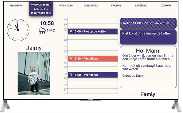 A web-based application designed for screens in care homes and day centers. Residents — especially elderly users and those with early-stage dementia — can view their daily schedule, family photos, messages, and make video calls with their children. The dashboard focuses on accessibility and clarity, with a calming, intuitive interface.