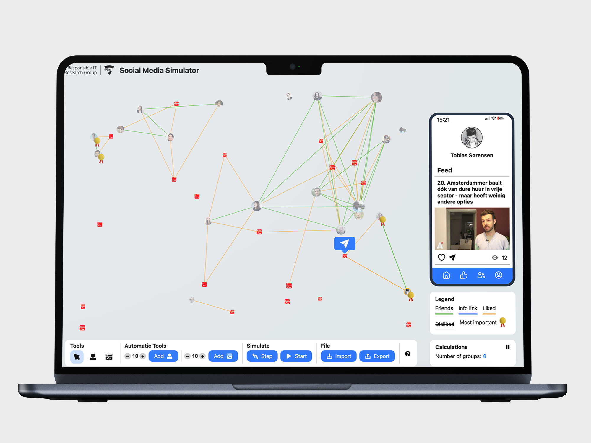 This project was developed as part of my minor in Web Design & Development for the Responsible IT master at the Amsterdam University of Applied Sciences. The goal was to show how a social network operates. The purpose of this application is to demonstrate how echo chambers (bubbles) form, how people become stuck inside those bubbles, and how this leads to being exposed only to fake news or one-sided information.